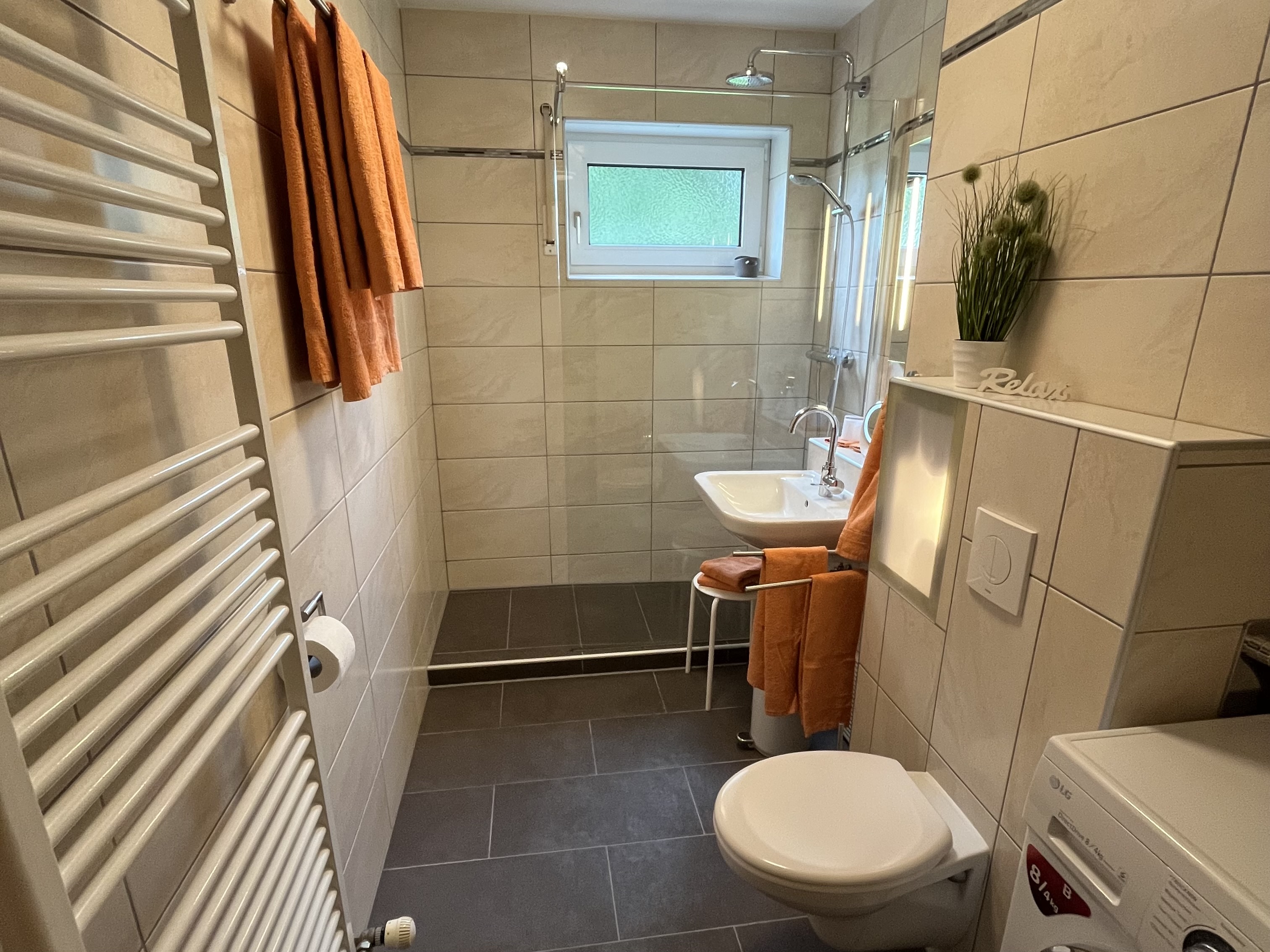 Bei Bedarf kann man seine Kleidung im Waschtrockner waschen und wenn man möchte auch gleich trocknen. Die Benutzung des Gerätes ist inklusive. Ein Wäscheständer ist in der Ferienwohnung auch vorhanden.
